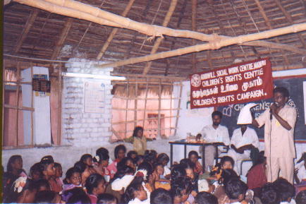 Goodwill Social Work Centre has set up a Children's Rights Centre (CRC) with a prime objective of proclaiming, protecting and defending Children's rights as affirmed in the United Nations Convention on the Rights of the Child (1989). Like in many other countries, the rights of children are still generally low on the agendas in India. It is evident from a study Report (Maheshwar Madan Lal, 1994) that the percentage of children in India who asserted their rights was negligible and a high majority of children were not even aware of their fundamental rights of children due to lack of education. Similarly, amongst adults, 10 percent were aware of the rights of the child while 15 percent gave this subject a thought. Only 7 percent were engaged in facilitating these rights to them. To create awareness and dissemination on the UN Convention, the following strategies have been adopted: